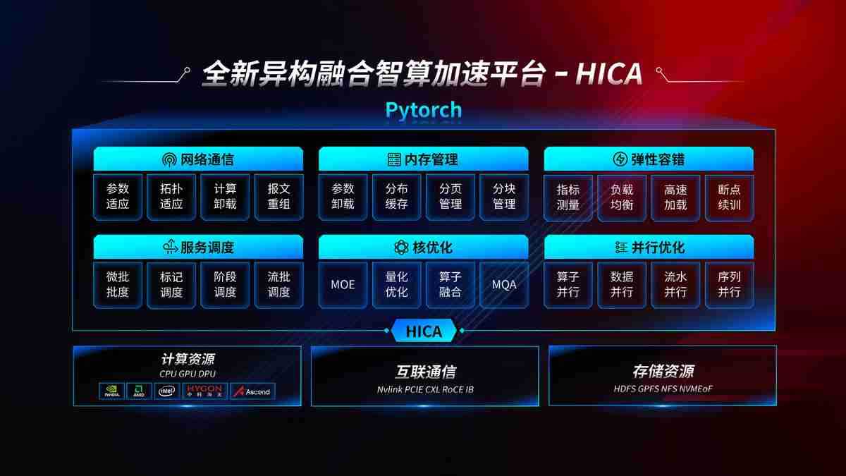 通过自研的服务层、、、中间适配层、、以及调度编排算法,,,采用数据并行、、、模型并行等多种并行方式,,,,把并行计算任务进行有效的分解,,,,使其分别由相应的软件栈和算力资源来承接。。。。当GPU资源变化,,,,HICA可以实时动态调度计算子任务并调整模型拓扑和架构,,,,以充分聚合各种算力资源。。