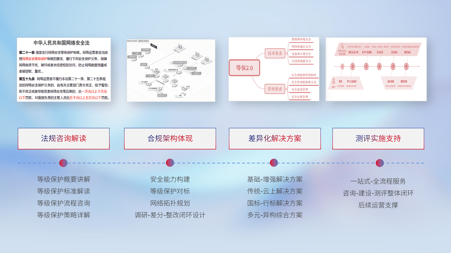 通过专业的法律咨询解读、、合规架构体现、、差异化解决方案、、、测试实施支持等服务,,,为客户量身打造等保合规体系。。